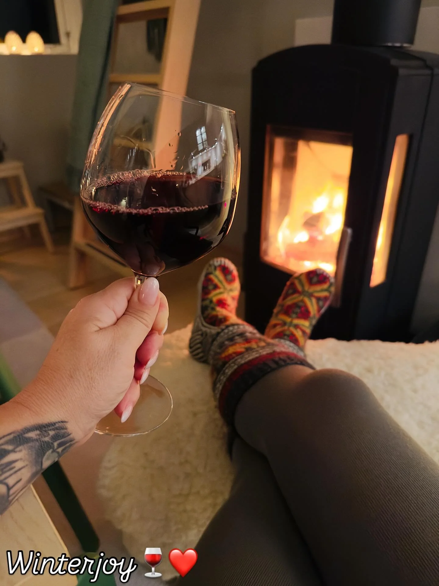 Bilde av fyr i peisen inne på havslottet, med et glass vin i hånden.